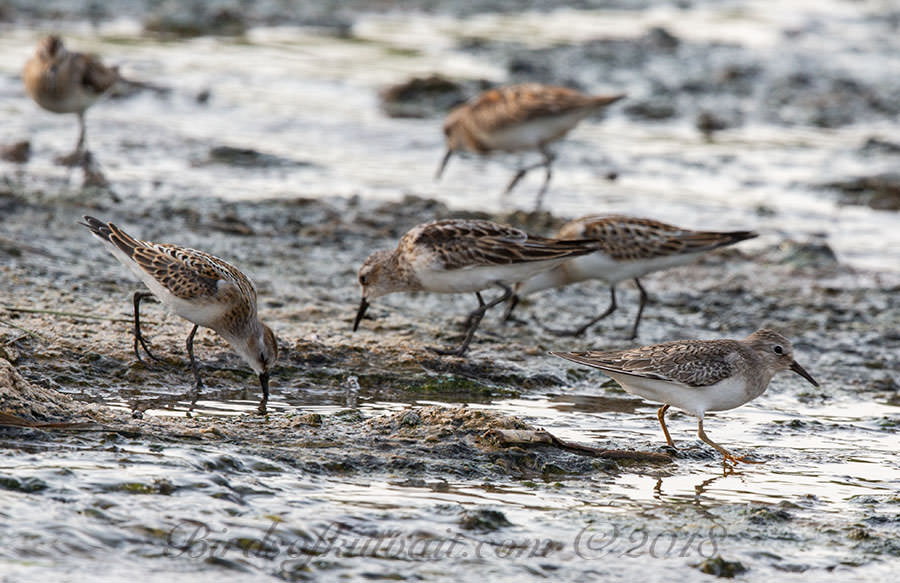 I like to compare sizes. Below the Temminck’s Stint on the left to compare with a group of Little Stint. It is a slightly smaller.